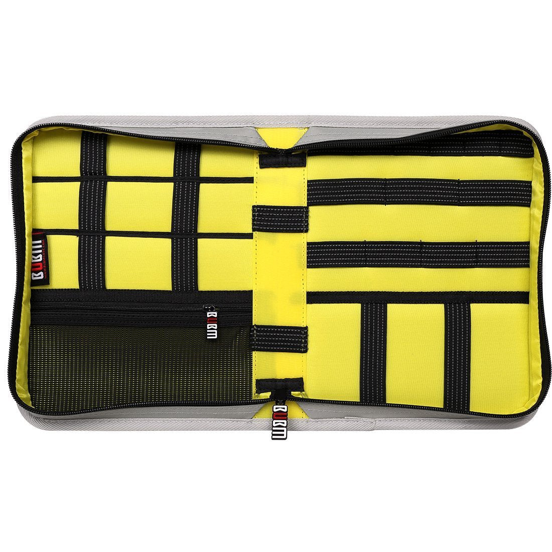 - 23 rubberized woven elastic loops to hold various items like cables, memory cards, hard drive, adapters, pens and etc.